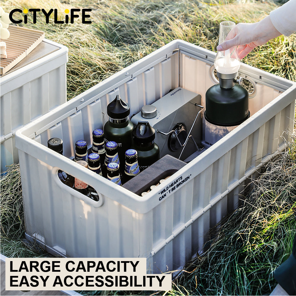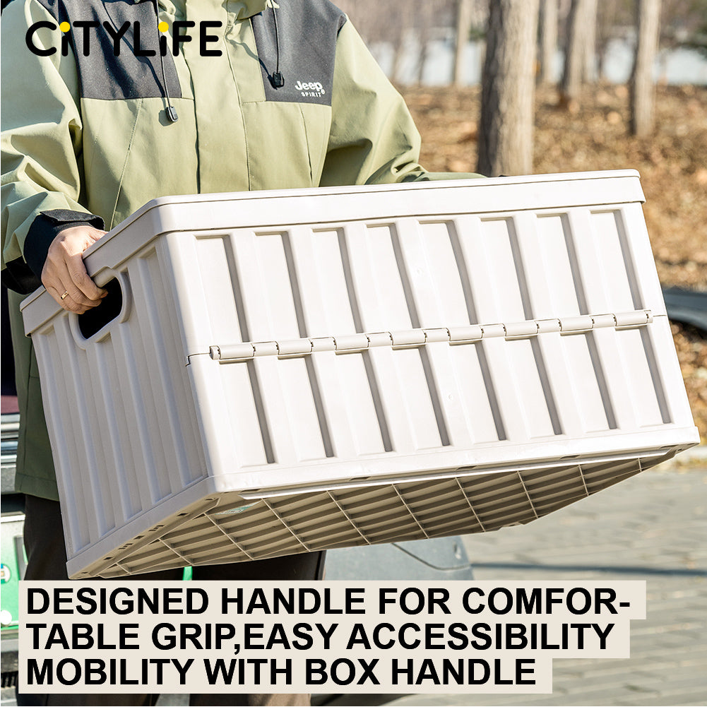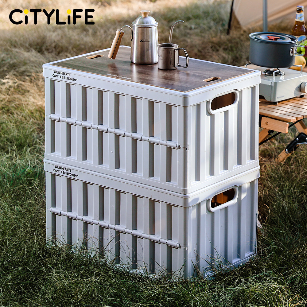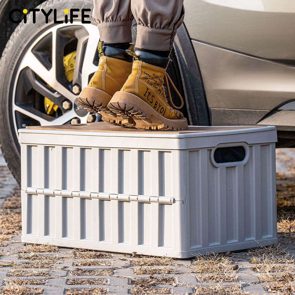 Citylife 64L Collapsible Storage Box Crate with Lid Folding Storage Box with Wooden Cover Panel for Home Outdoor Camping